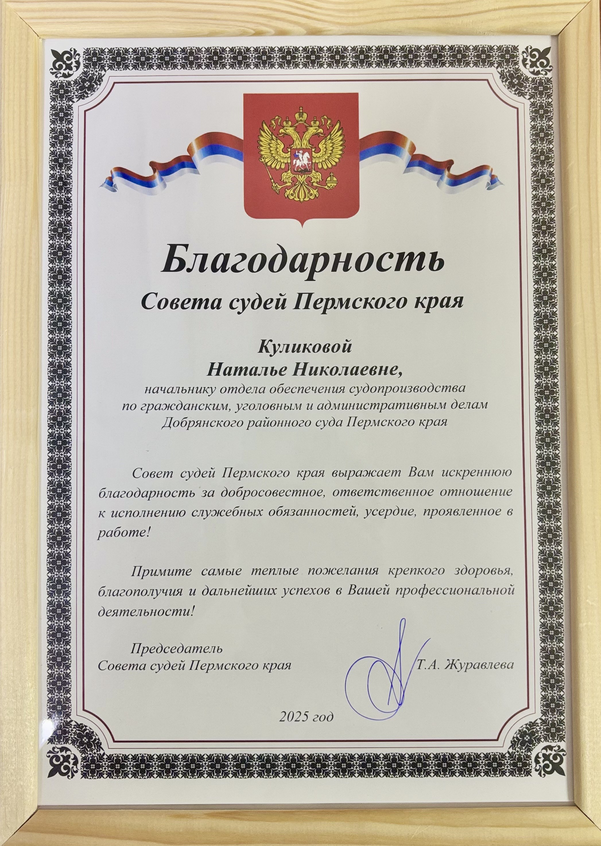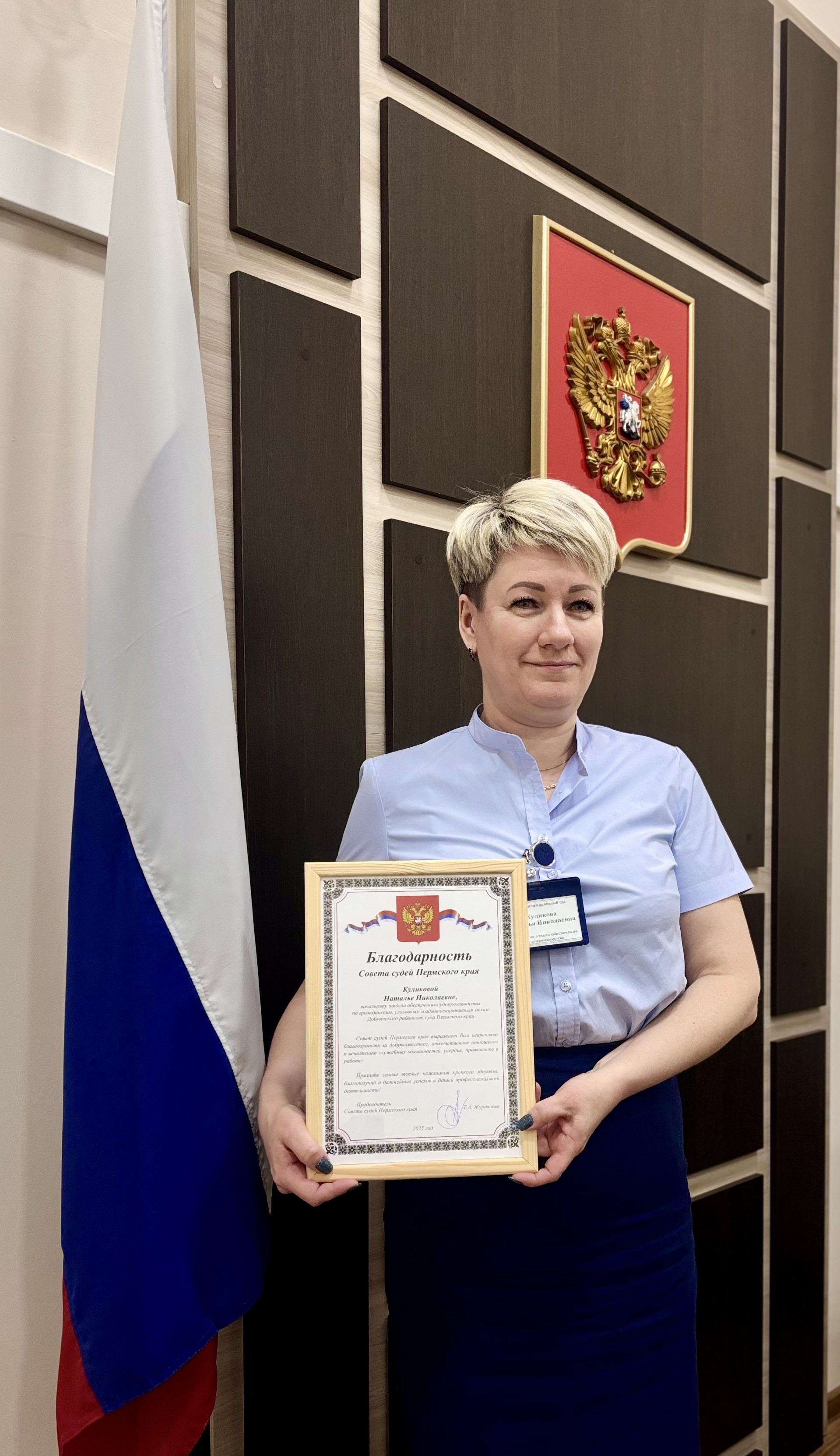 Сегодня, в торжественной обстановке, председатель суда Владимир Викторович Неволин вручил начальнику отдела обеспечения судопроизводства по гражданским, уголовным и административным делам Добрянского районного суда Пермского края Куликовой Наталье Николаевне благодарность Совета судей Пермского края. Получение благодарности от Совета судей является свидетельством признания значимости и важности труда сотрудников аппарата, подчеркивая их важную роль в укреплении доверия общества к судебным органам власти. Коллектив Добрянского районного суда Пермского края поздравляет коллегу с заслуженной наградой желает Наталье Николаевне дальнейших успехов в профессиональной деятельности! ![]() ![]() |